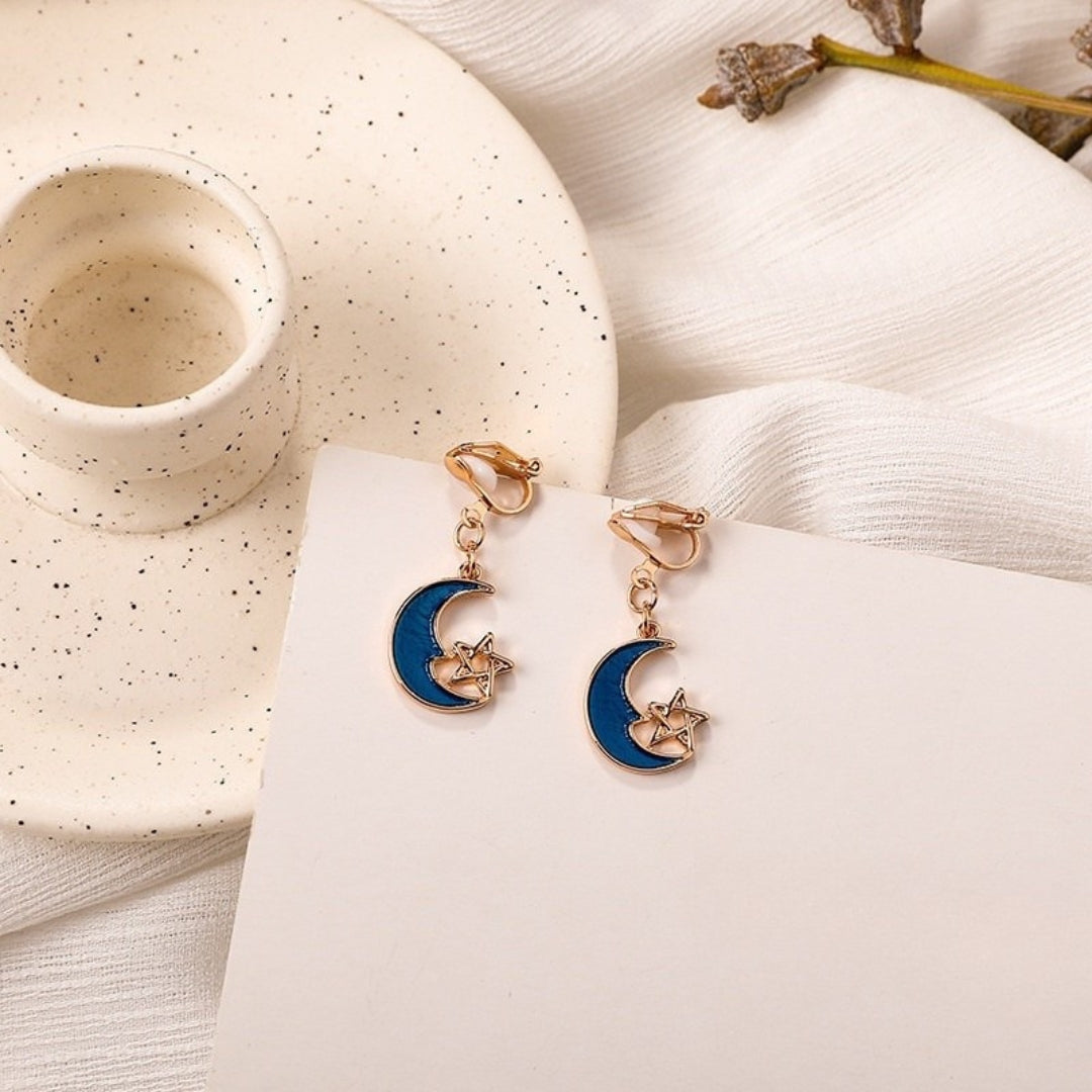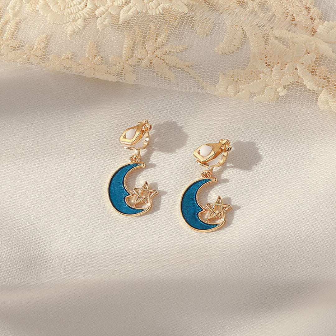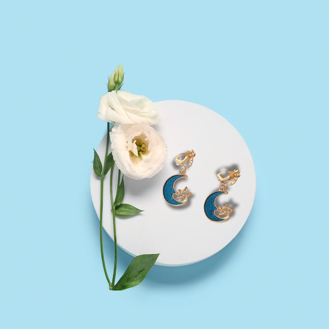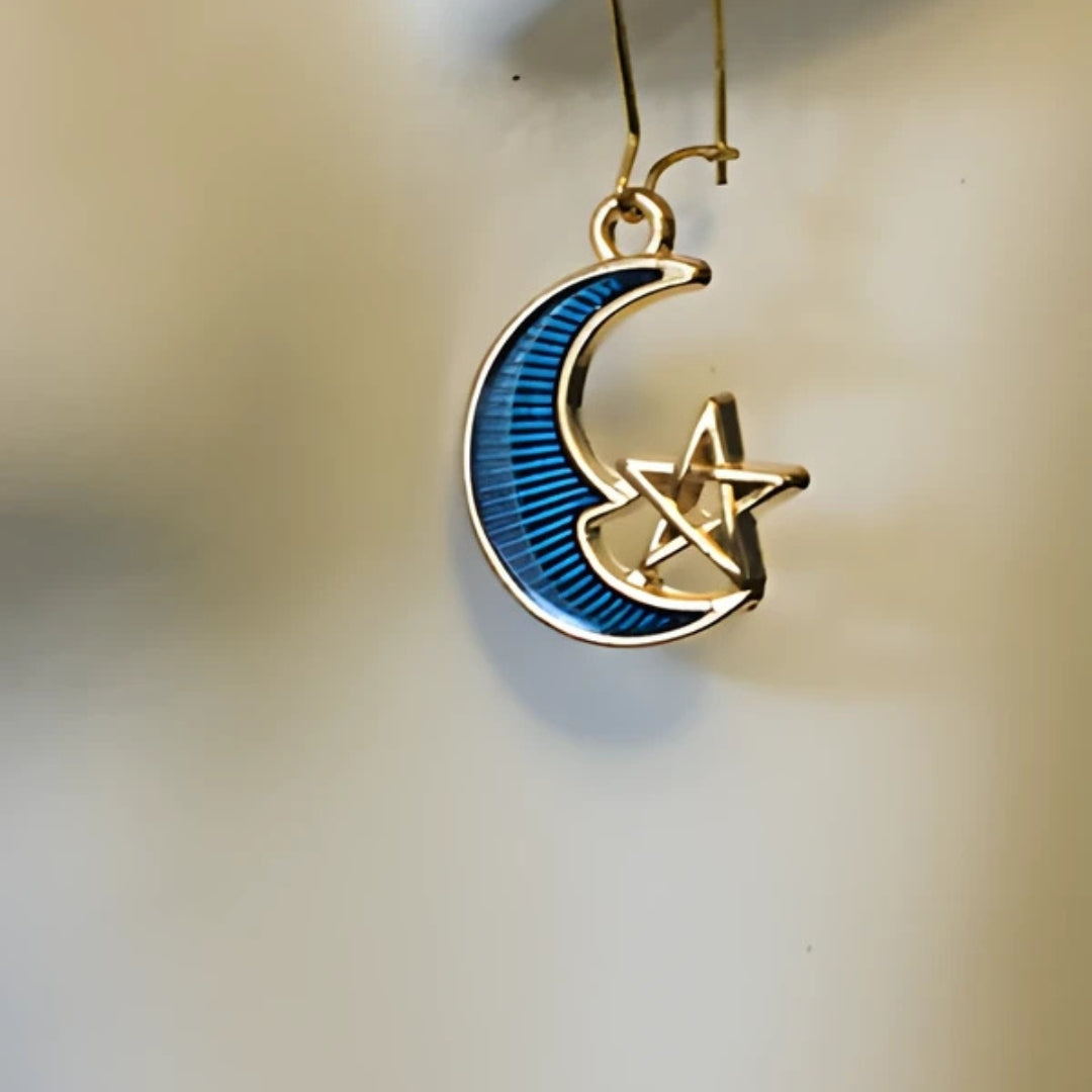 Diese eleganten Ohrringe zeichnen sich durch ein zartes Halbmonddesign aus, das durch einen kleinen Stern akzentuiert wird. Die Kombination aus tiefblauem Emaille und goldfarbenem Metall sorgt für einen raffinierten himmlischen Look. Sie eignen sich sowohl für Freizeitkleidung als auch für formelle Anlässe und verleihen jedem Outfit einen Hauch von Charme und Eleganz.