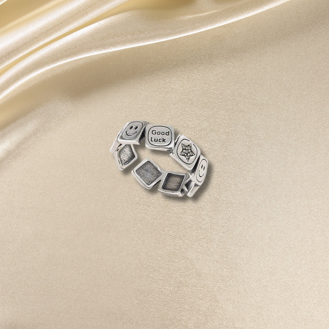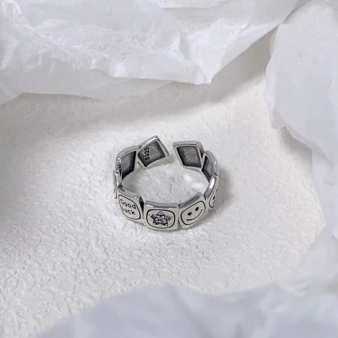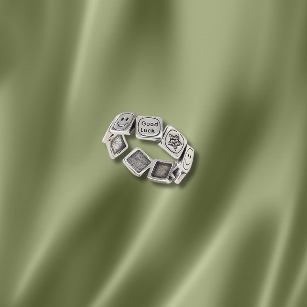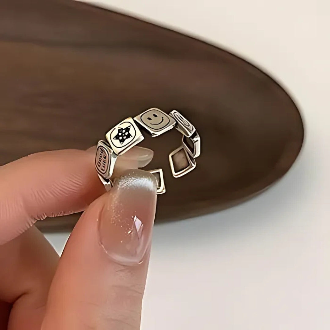 Dieser stilvolle, verstellbare Ring ist mit einer Reihe von eingravierten Smileys und einzigartigen geometrischen Mustern verziert, die ihm einen verspielten und dennoch ausgefallenen Look verleihen. Mit seinem Vintage-Finish in Silberton ist er ein vielseitiges Accessoire, das sowohl Casual- als auch Streetwear-Looks Charakter verleiht.