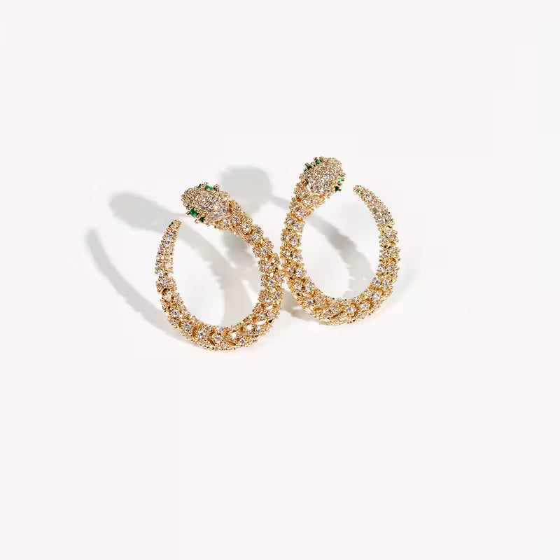 Draw all eyes to you with this striking, snake-inspired jewelry set featuring a statement necklace and matching hoop earrings. Crafted in golden tones and adorned with sparkling crystals, the necklace elegantly coils around the neck, ending in a snake head with enchanting green eyes.